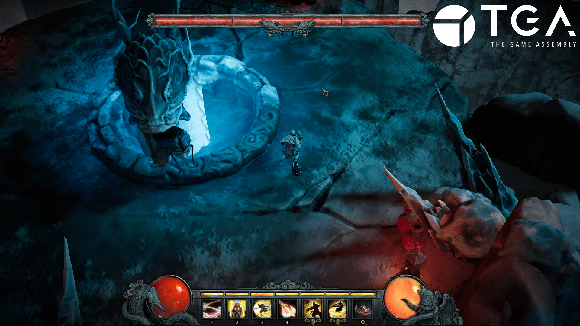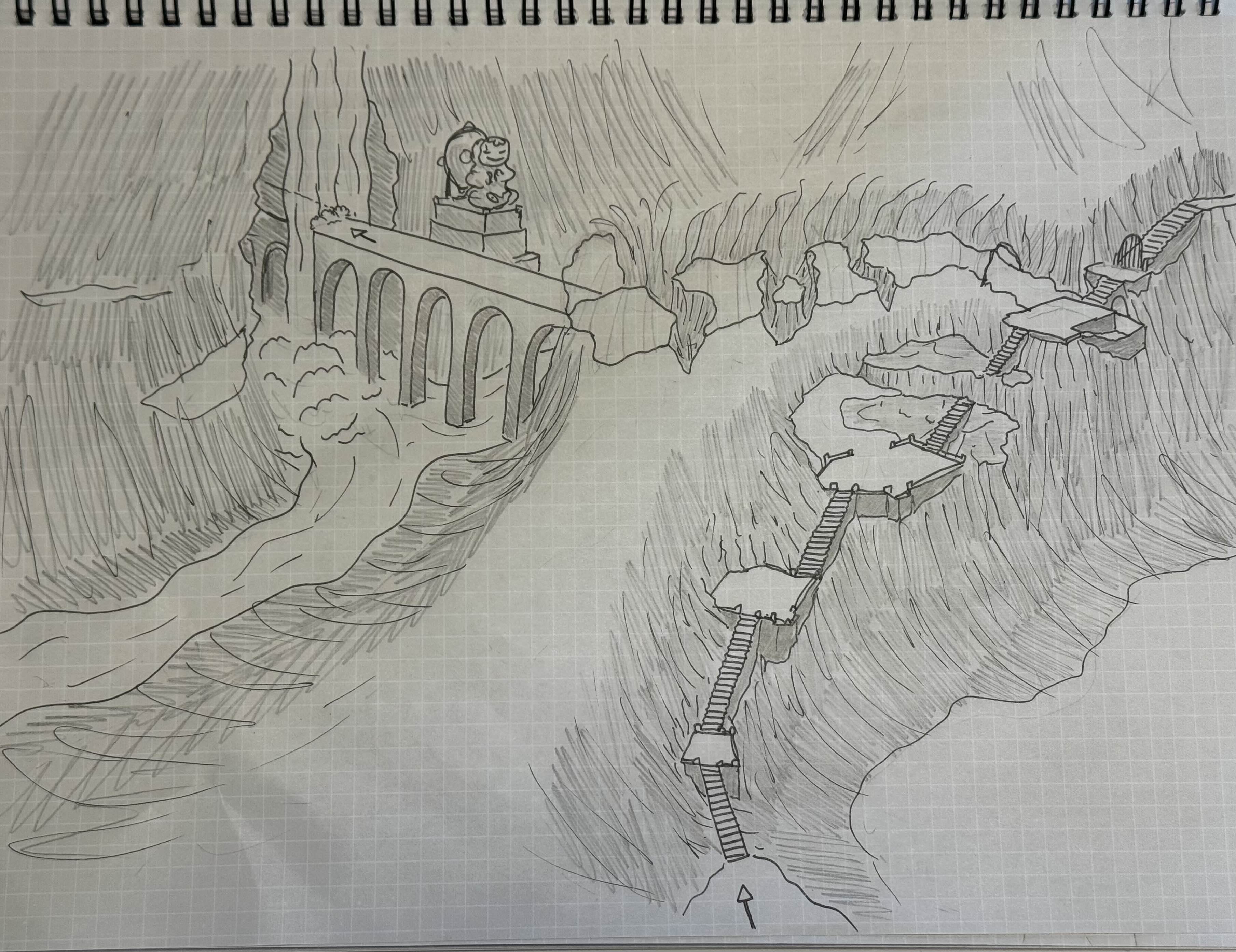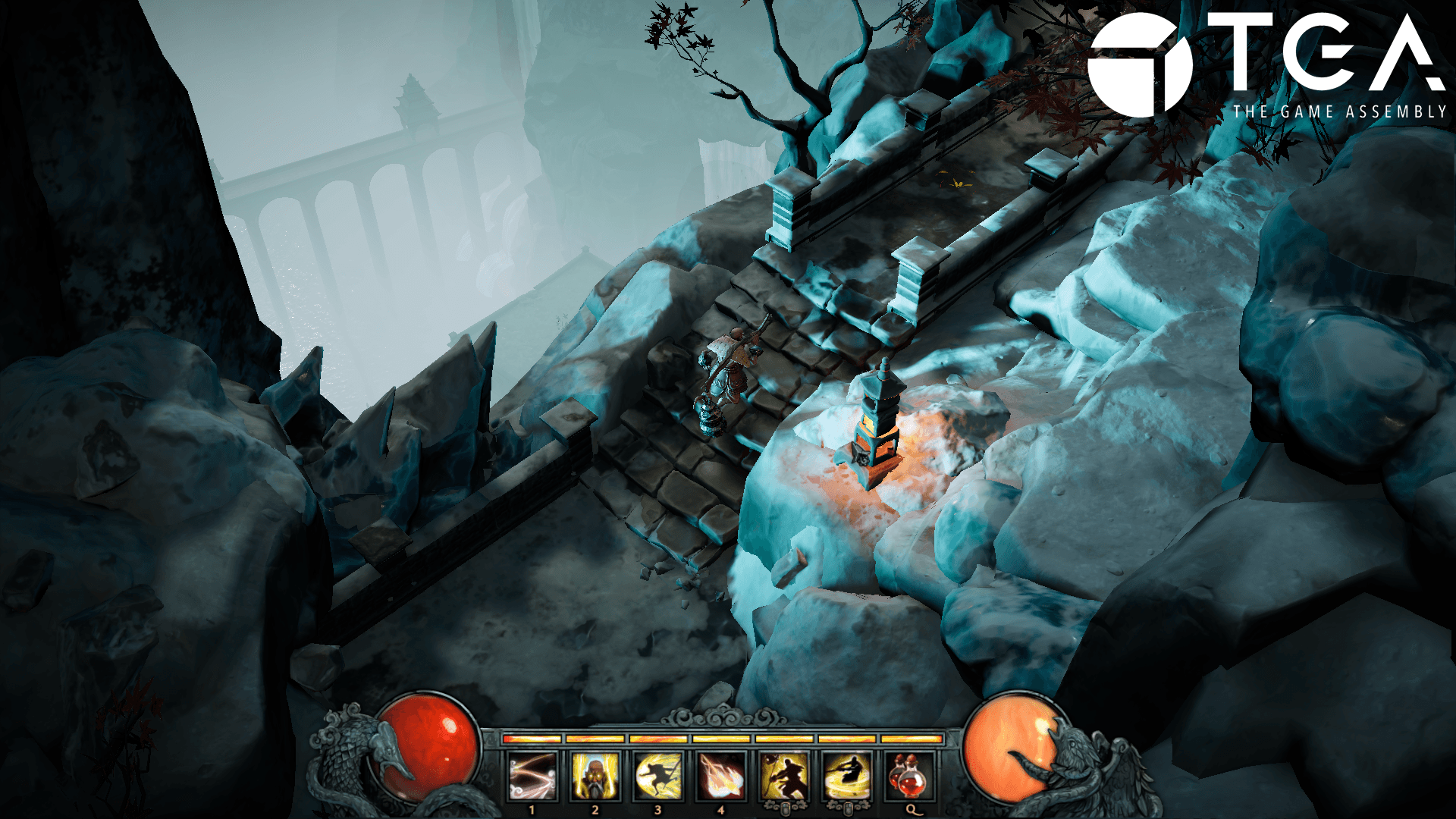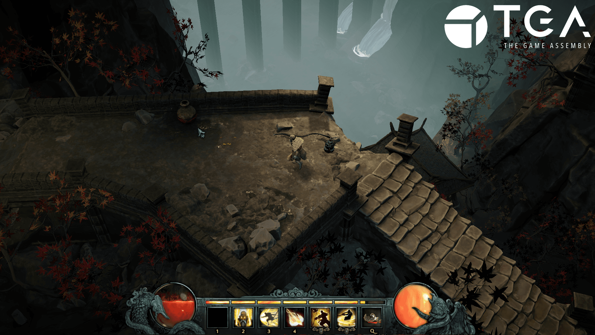 On a tall mountain, the dragon of the ocean has taken control over the people, turning them into grotesque fish monsters and draining them of their riches in his greed. As a monk wielding a staff and harnessing spiritual abilities, climb the mountain whilst battling the monsters and freeing the people from the dragon who awaits you at the summit.